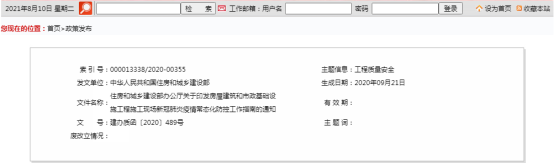 2020年9月21日,住建部发布《房屋建筑和市政基础设施工程施工现场新冠肺炎疫情常态化防控工作指南的通知》,通知明确: